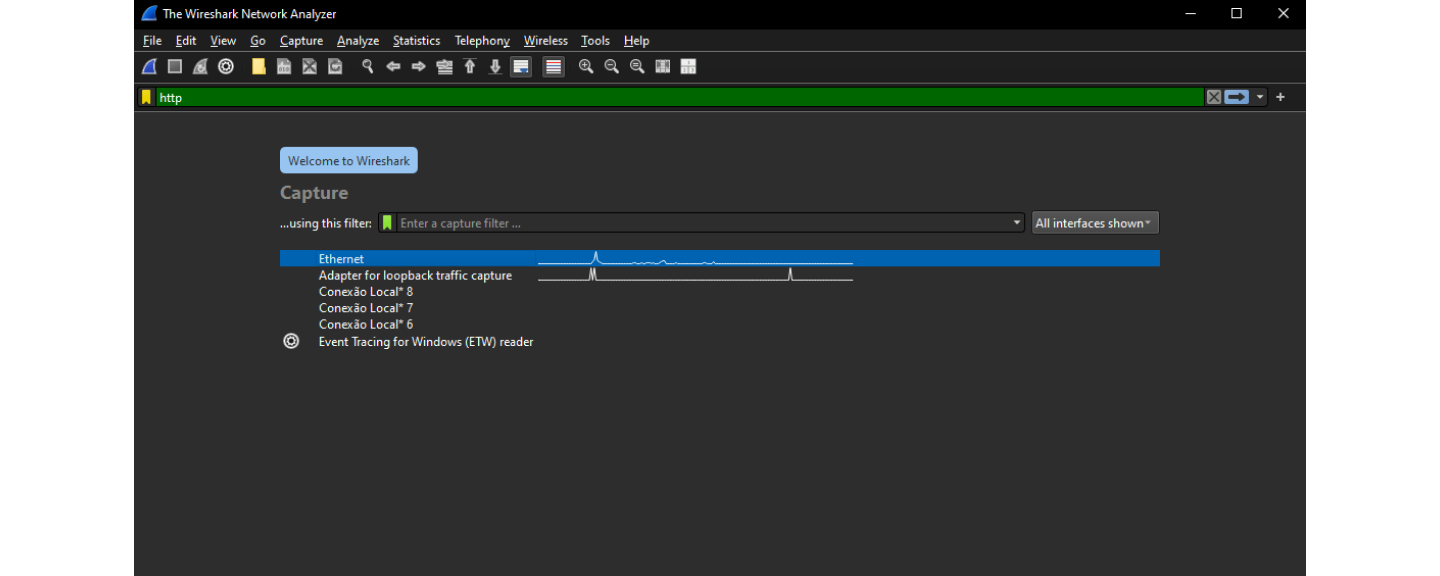 Abra o Wireshark em seu computador e selecione a interface de rede que você usará para capturar o tráfego (seja Wi-Fi ou Ethernet). Inicie a captura clicando no botão de "Iniciar Captura". No campo de filtro do Wireshark, você pode aplicar filtros específicos para facilitar a visualização do tráfego: